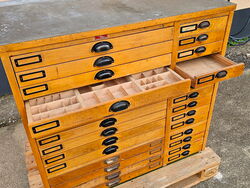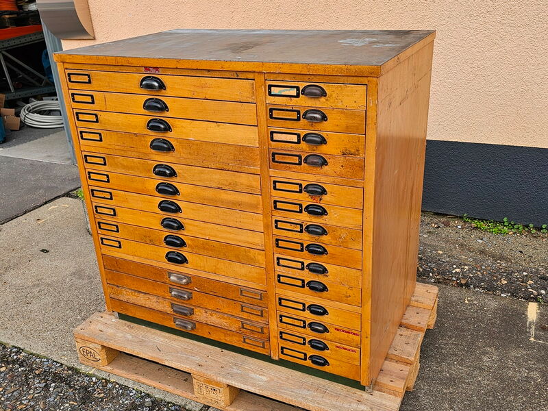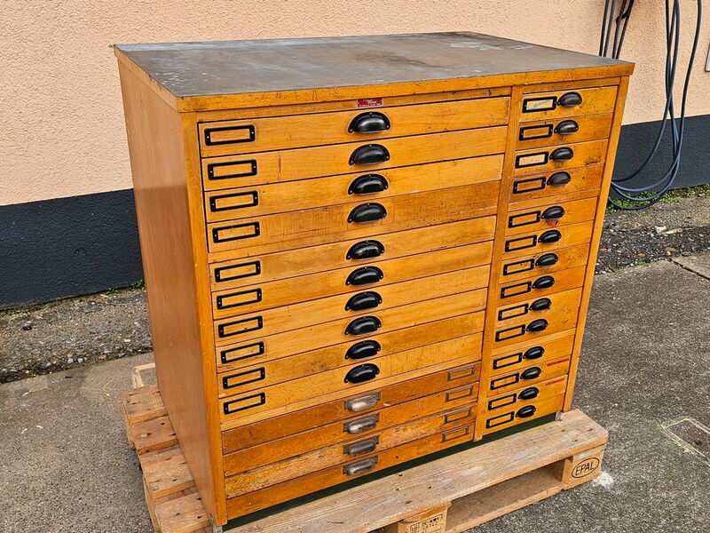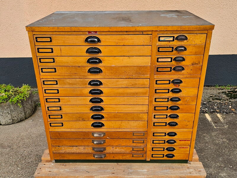 Setzschrank „Paulina“ hat 14 Setzkästen mit Holzeinteilung in 66 cm Breite und 14 Schubladen in 27 cm Breite. „Paulina“ hat durch langjährigen Einsatz die üblichen Gebrauchsspuren.