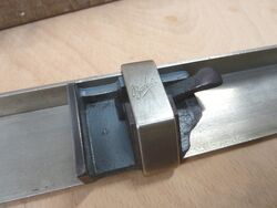 Ein gebrauchter 25 cm langer Winkelhaken mit verstellbarem Winkelstück (Frosch, wie die Setzer es nennen).